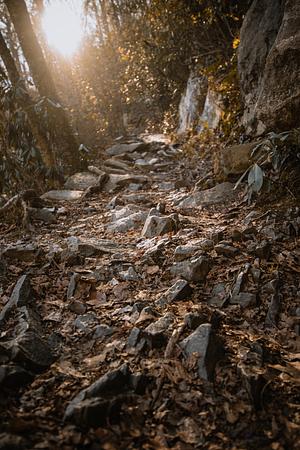 Sunlight streams through the trees and shines on the trail leading to Laurel Falls in the Great Smoky Mountains National Park.